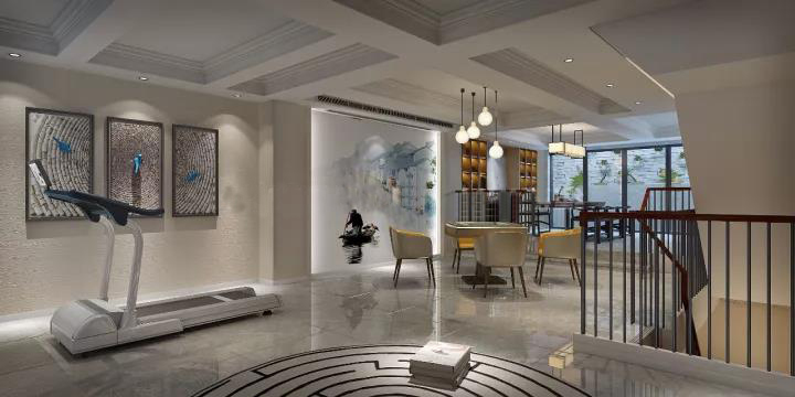 客厅在别墅装修中以暖灰色调作为整个空间的基调,装饰整洁利落。点缀其中的蓝色与黄色,平衡了空间的氛围,更显淡雅与清爽。